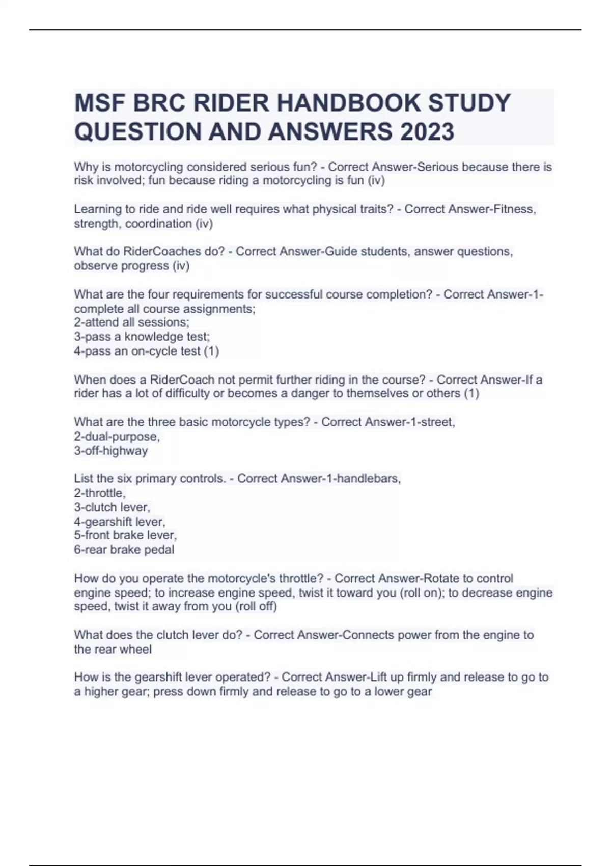 MSF BRC RIDER HANDBOOK STUDY QUESTION AND ANSWERS 2023 MSF Stuvia US