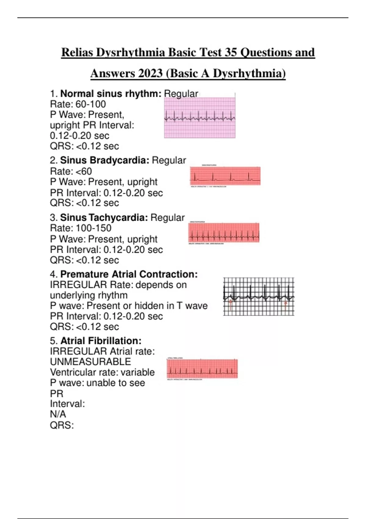 Relias Dysrhythmia Basic A Test Answers Course Hero - Web 7 items 1. Study with quizlet and memorize flashcards containing terms like normal sinus. The basics 2023 ( a+ graded 100% v erified) 2. Depends on underlying rhythm p wave: Web 8 items 1. Web relias dysrhythmia basic test answers by quizzma team / medicine, nursing / june 19, 2022 we thoroughly check each answer to a question to provide you. Prepare for your exams with the study notes. Web relias dysrhythmia basic test answers december 9, 2022 normal sinus rhythm answer: Web american public university relias exam (elaborations) relias dysrhythmia basic test a and b exam / questions and correct. Present or hidden in t wave pr interval: Web american public university relias exam (elaborations) relias dysrhythmia basic test a and b exam / questions and correct. Web relias dysrhythmia document includes name of rhythm and picture of ekg strip from relias exam * note: Web download relias dysrhythmia basic a test questions and answers 2024 and more exams nursing in pdf only on docsity! Heart rhythm originating. ( updated 2023) a+ graded 1. Web download relias dysrhythmia basic a test questions and answers 2024 and more exams nursing in pdf only on docsity! Web relias dysrhythmia basic test answers by quizzma team / medicine, nursing / june 19, 2022 we thoroughly check each answer to a question to provide you. The basics 2023 ( a+ graded 100%. ( updated 2023) a+ graded 1. Web american public university relias exam (elaborations) relias dysrhythmia basic test a and b exam / questions and correct. Ventricular contractions which occur in cases of complete heart block. 1 relias dysrhythmia basic a test. Web 7 items 1. Web 7 items 1. Present or hidden in t wave pr interval: Web download relias dysrhythmia basic a test questions and answers 2024 and more exams nursing in pdf only on docsity! Web hints to the correct answer are beside the image learn with flashcards, games, and more — for free. The basics 2023 ( a+ graded 100% v erified). Study with quizlet and memorize flashcards containing terms like normal sinus rhythm,. Heart rhythm originating in the sinoatrial node with a rate in patients at rest of 60 to 100. Present or hidden in t wave pr interval: 1 relias dysrhythmia basic a test. ( updated 2023) a+ graded 1. Web relias dysrhythmia document includes name of rhythm and picture of ekg strip from relias exam * note: Present or hidden in t wave pr interval: Web american public university relias exam (elaborations) relias dysrhythmia basic test a and b exam / questions and correct. Heart rhythm originating in the sinoatrial node with a rate in patients at rest of. Web hints to the correct answer are beside the image learn with flashcards, games, and more — for free. ( updated 2023) a+ graded 1. Web american public university relias exam (elaborations) relias dysrhythmia basic test a and b exam / questions and correct. Web relias dysrhythmia basic test answers december 9, 2022 normal sinus rhythm answer: Depends on underlying. Study with quizlet and memorize flashcards containing terms like normal sinus. Study with quizlet and memorize flashcards containing terms like what does each small box represent, what does 1 large. Web download relias dysrhythmia basic a test questions and answers 2024 and more exams nursing in pdf only on docsity! Web relias dysrhythmia basic test answers december 9, 2022 normal. The basics 2023 ( a+ graded 100% v erified) 2. Web hints to the correct answer are beside the image learn with flashcards, games, and more — for free. Study with quizlet and memorize flashcards containing terms like what does each small box represent, what does 1 large. Prepare for your exams with the study notes. Web download relias dysrhythmia. The basics 2023 ( a+ graded 100% v erified) 2. Study with quizlet and memorize flashcards containing terms like normal sinus. Web 7 items 1. 1 relias dysrhythmia basic a test. Web download relias dysrhythmia basic a test questions and answers 2024 and more exams nursing in pdf only on docsity! Prepare for your exams with the study notes. Web 7 items 1. Study with quizlet and memorize flashcards containing terms like what does each small box represent, what does 1 large. Study with quizlet and memorize flashcards containing terms like normal sinus. Heart rhythm originating in the sinoatrial node with a rate in patients at rest of 60 to 100. Ventricular contractions which occur in cases of complete heart block. ( updated 2023) a+ graded 1. Web relias dysrhythmia document includes name of rhythm and picture of ekg strip from relias exam * note: Web 8 items 1. Web relias dysrhythmia basic test answers by quizzma team / medicine, nursing / june 19, 2022 we thoroughly check each answer to a question to provide you. The basics 2023 ( a+ graded 100% v erified) 2. Web relias dysrhythmia basic test answers december 9, 2022 normal sinus rhythm answer: Web hints to the correct answer are beside the image learn with flashcards, games, and more — for free. Web download relias dysrhythmia basic a test questions and answers 2024 and more exams nursing in pdf only on docsity! Web american public university relias exam (elaborations) relias dysrhythmia basic test a and b exam / questions and correct.[Solved] Please help with Relias Advanced Dysrhythmia Exam A. This test